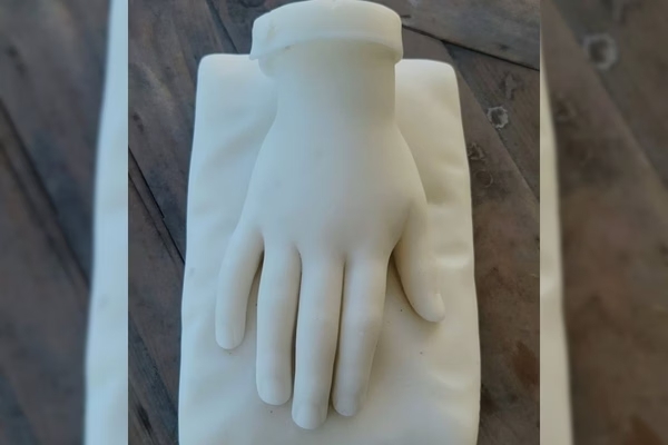 A escultura retrata a mão de uma criança. Ali Noble se interessou pela peça para treinar suas habilidades com tatuagem e nem percebeu que se tratava de um item feito em mármore.