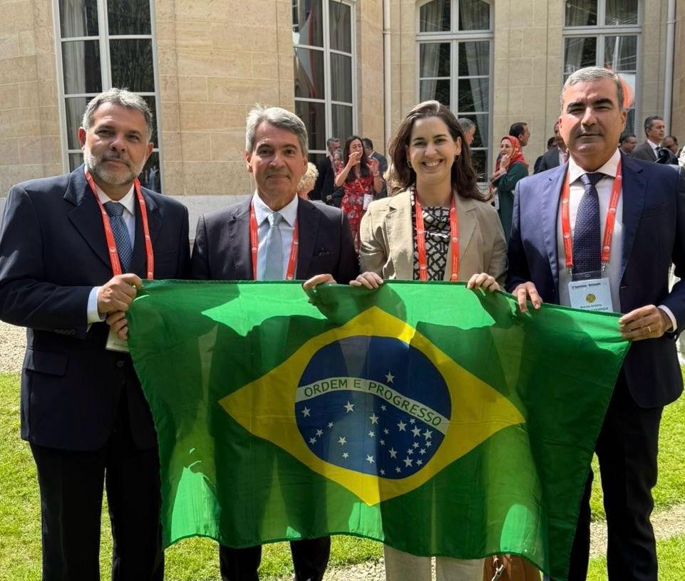 O presidente do Sistema Faeal/Senar, Álvaro Almeida, comemorou na manhã desta quinta-feira (29), o anúncio do novo status sanitário do Brasil, feito em Paris, pela Organização Mundial da Saúde Animal, durante a 92ª Sessão Geral da Assembleia Mundial de Delegados da OMSA. Ele recebeu a notícia dos representantes da Federação alagoana, presentes no evento, os pecuaristas André Ramalho e Domício Silva. A comitiva do estado também contou com o presidente da Adeal, Marco Albuquerque, pelo Governo Estadual; e com a representantes do Ministério da Agricultura em Alagoas, Sônia Lages.