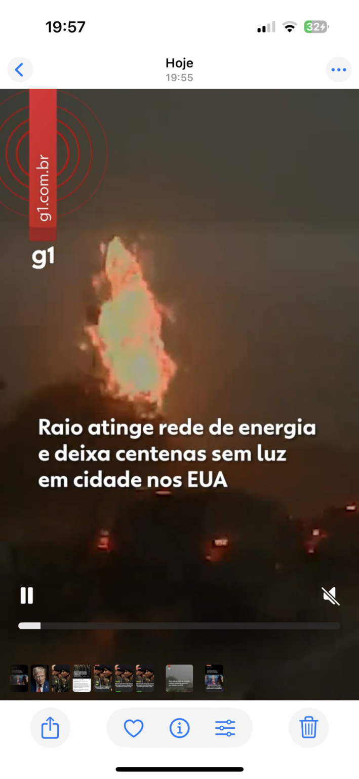 As imagens, feitas pela câmera do painel de um veículo, mostram quando um raio atinge a rede elétrica, na lateral de uma rodovia, causando uma enorme labareda de fogo e, depois, uma explosão e faíscas do outro lado.