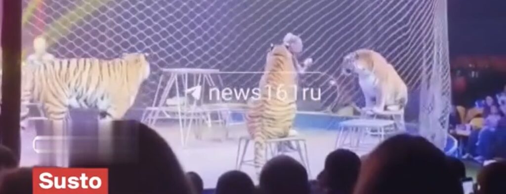 IMAGENS IMPRESSIONANTES – Um tigre saltou em direção à plateia durante uma apresentação de circo no sul da Rússia, provocando pânico entre os espectadores. Vídeos que circulam nas redes sociais mostram o momento em que, logo no início do espetáculo, a barreira de proteção desaba e um dos animais escapa do palco em direção ao público.