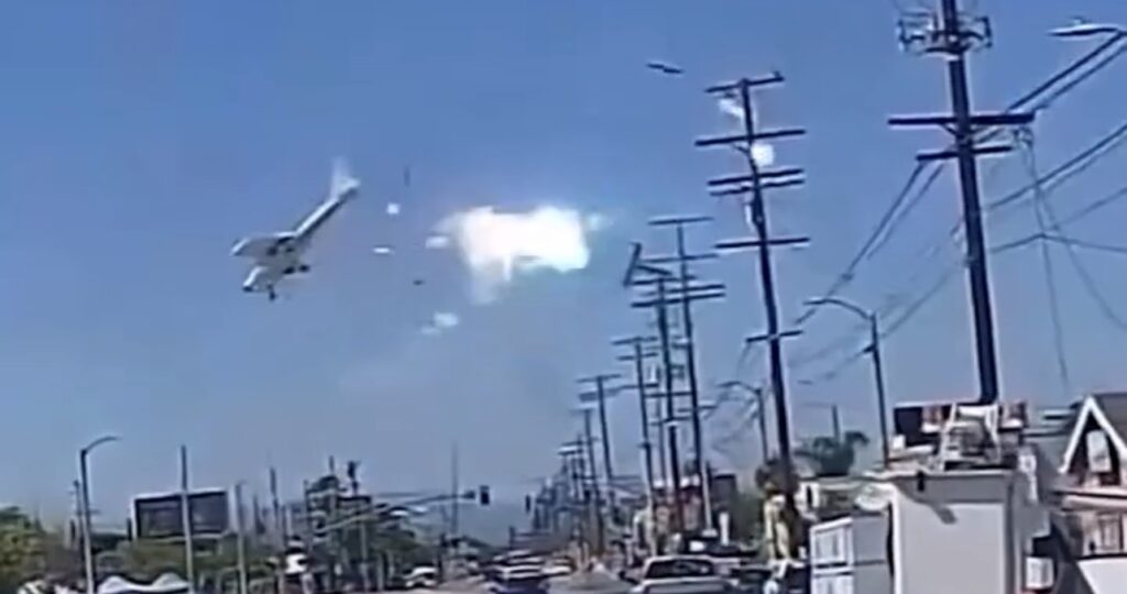 Um avião de pequeno porte atingiu um poste de energia antes de cair no estacionamento de uma loja em Los Angeles, nos Estados Unidos, na manhã de segunda (20). Um vídeo que circula nas redes sociais mostra o momento em que a aeronave acerta fios de alta tensão